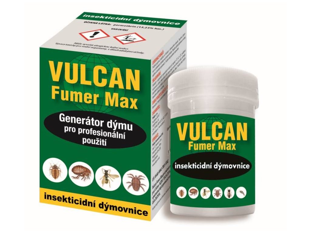Velmi účinný a rychle působící širokospektrální insekticid na bázi generátoru dýmu, který usmrcuje hmyz jako dotykový a požerový jed a který má také vynikající fumigační vlastnosti. Dráždivé účinky vyvolávají neklid a dráždí skrytě žijící druhy (v puklinách, škvírách) ke kontaktu s přípravkem. Vulcan Fumer Max obsahuje účinnou látku permethrin. Přípravek vyvíjí hustý dým, na jehož mikročásticích je velice jemně rozptýlen účinný insekticid. Výsledkem je rychlý, ochromující účinek na hmyzí škůdce. Účinná látka působí na hmyz dráždivě a nutí i skrytě žijící jedince ke kontaktu s dýmem. Hmyz po kontaktu s dýmem hyne ve velmi krátké době a to dotykově, požerově i fumigačně.